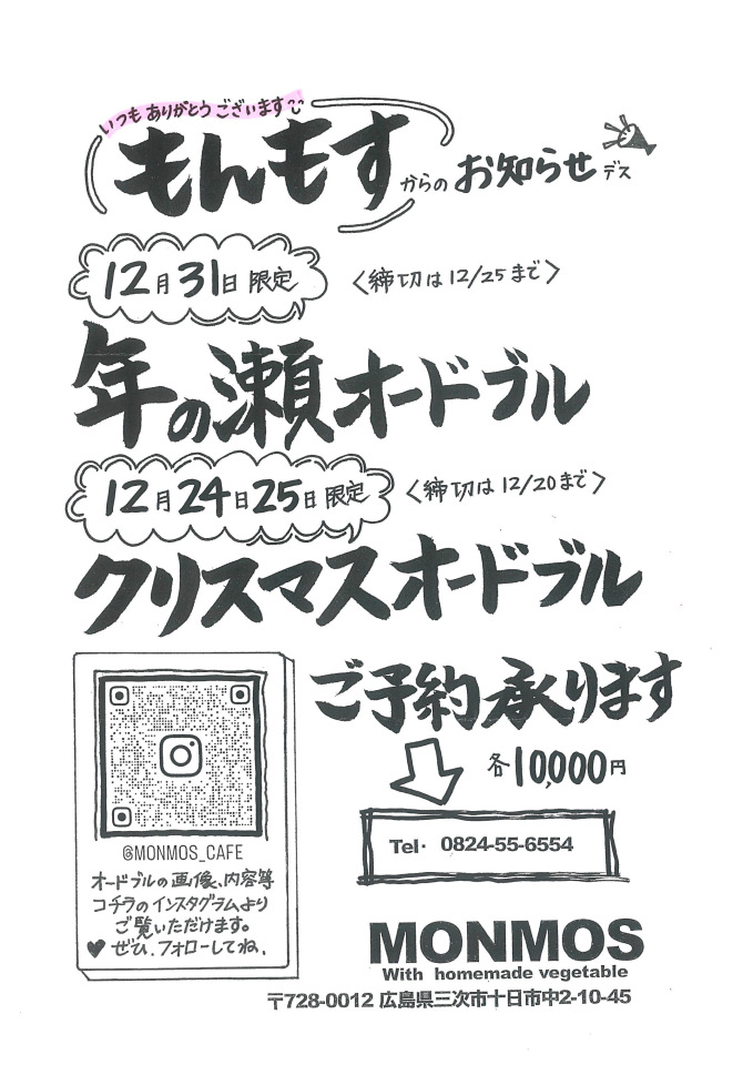 ご家族やご友人との集まりにぴったり!MONMOS cafeクリスマス&年の瀬オードブルのご案内です。
