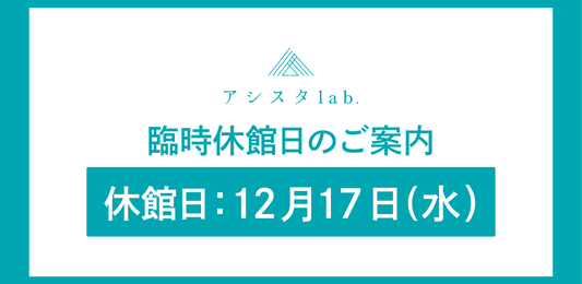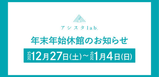 いつもアシスタlab.をご利用いただき、誠にありがとうございます。 アシスタlab.は下記の期間、年末年始休館とさせていただきます。 【休館期間】 2025年12月27日(土)~2026年1月4日(日) 新年は 1月5日(月)より通常通り開館いたします。 2026年…