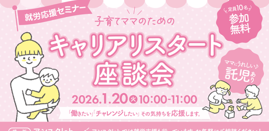 \参加無料・託児あり/ 子育てママのための『キャリアリスタート座談会』を開催します! 「そろそろ仕事を再開したいけれど、何から始めたらいいか不安…」「子育てとの両立ができる働き方って?」「私に向いている仕事ってなんだろう?」 そんな思いを抱えるママたちのための、就労応援セミナー “キャリアリス…